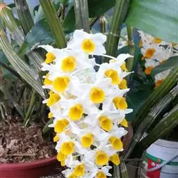 球花石斛,是兰科石斛属的多年生附生草本。茎直立或斜立,圆柱形,粗壮,基部收狭为细圆柱形,不分枝,…