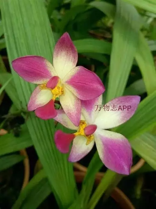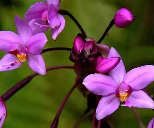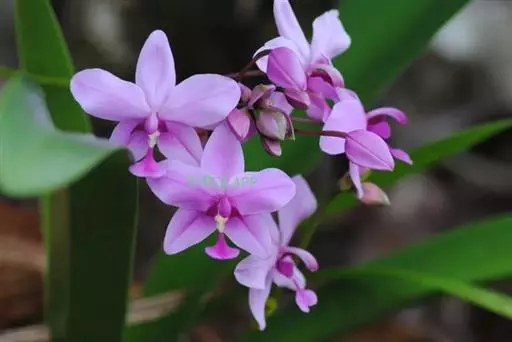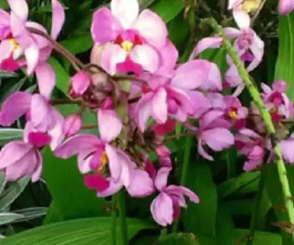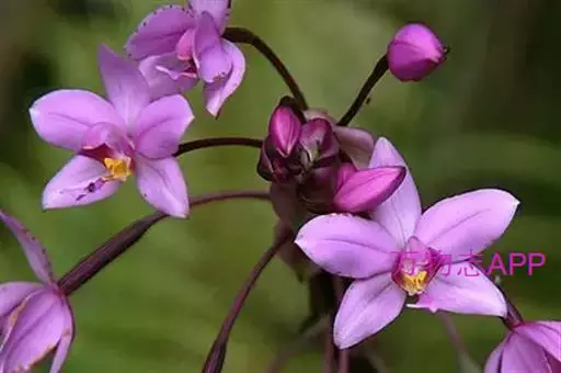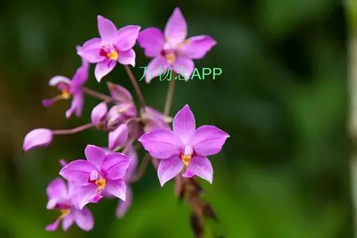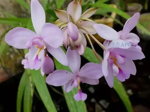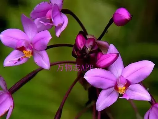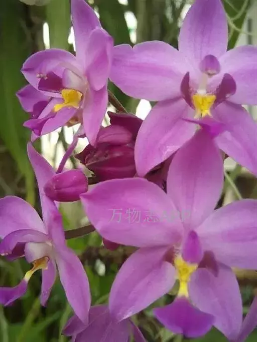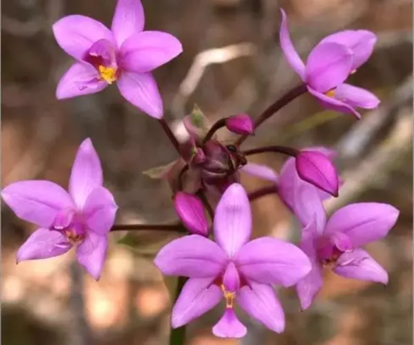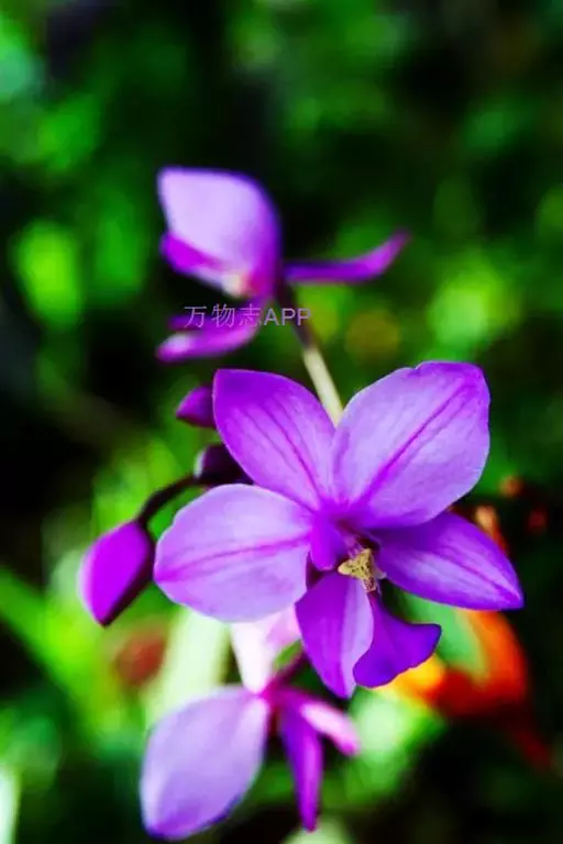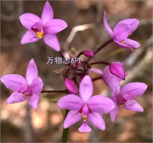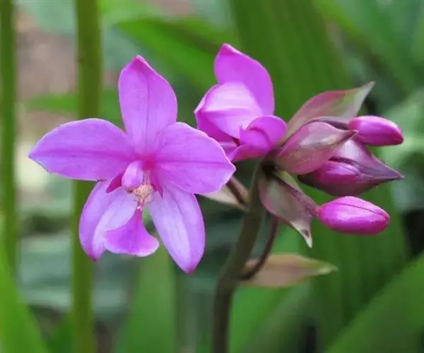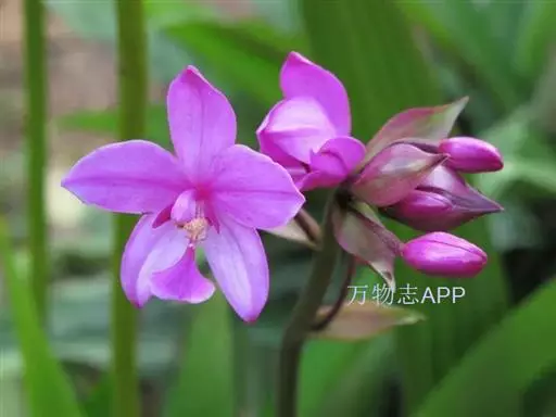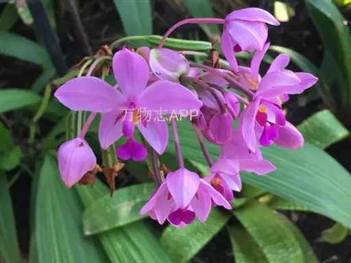紫花苞舌兰(学名:Spathoglottis plicata Bl.):植株高达1米。假鳞茎卵状圆锥形,具3-5枚叶。叶质地薄,淡绿色,狭长,具折扇状的脉。花葶长达1米,下部具数枚筒状鞘;总状花序短,具约10朵花;花紫色;花瓣近椭圆形,比萼片大,先端锐尖;唇瓣贴生于蕊柱基部,长约1.5厘米,3裂。花期常在夏季。