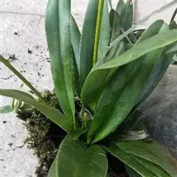 紫花苞舌兰植株高达1米。假鳞茎卵状圆锥形,长约3厘米,粗1-1.7厘米,为叶鞘所包,具3-5枚叶。叶质地薄,淡绿色,狭长,长30-80厘米,宽5-7厘米,先端渐尖或急尖,基部收狭为长柄,具折扇状的脉;叶柄长10-20厘米。