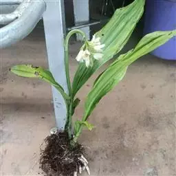 方法一 准备好兰盆及植料后,将兰株倒拿(根在上,叶在下)放于水龙头下以慢水冲洗,但水压切忌过强,以免伤兰根及叶子。用拇指和食指抓住兰头,小指抵住盆缘,用竹筷将根固定,当放入盆内时,尽量不要让根接触到盆壁。将豆粒大的混合石砾倒入盆底至三分之一处。然后倒入中粒植料至五分之四处,填实和尽量不要留下空间。将竹筷拔出,并摇实盆中植料。填实植料后,再用大粒植料埴入至距盆缘1.5厘米处。最后再倒入豆粒大植料,以将假鳞茎全部埋入土中为度,然后充分摇实。用压土工具轻压植料,并将表面弄平。种植完毕后,植料在盆中以中央稍高为好。