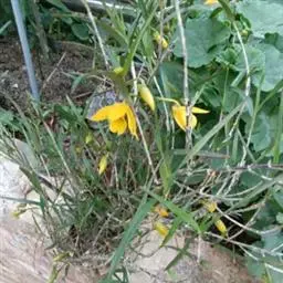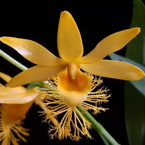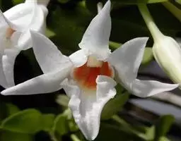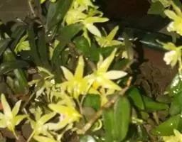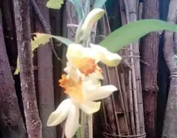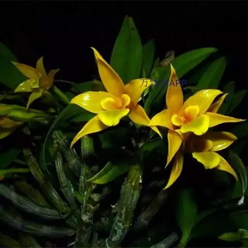 翅梗石斛(学名:Dendrobium trigonopus Rchb. f.):茎丛生,肉质状粗厚,呈纺锤形或有时棒状,不分枝,具3-5节,干后金黄色。叶厚革质,3-4枚近顶生,长圆形。总状花序出自具叶的茎中部或近顶端,常具2朵花,花下垂,不甚开展,质地厚,除唇盘稍带浅绿色外,均为蜡黄色;花瓣卵状长圆形,长约2.5厘米,宽1.1厘米,先端急尖,具8条脉;唇瓣直立,与蕊柱近平行,长2.5厘米,基部具短爪,3裂。花期3-4月。