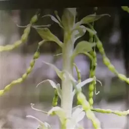 总状花序多花而疏离,具明显花序轴。苞片披针形至长圆状披针形,长约4-7毫米。花梗长3-5毫米。花黄色至黄白色,近平展。萼片卵圆形,长约2毫米,边缘具小齿。外花瓣勺状,具龙骨状突起,顶端较狭,微凹至近平截,鸡冠状突起仅限于龙骨状突起之上,不伸达顶端。