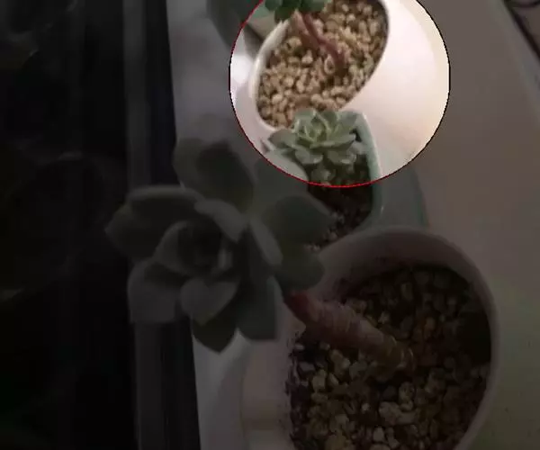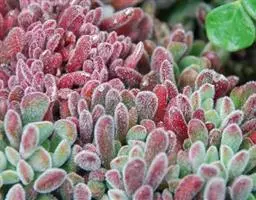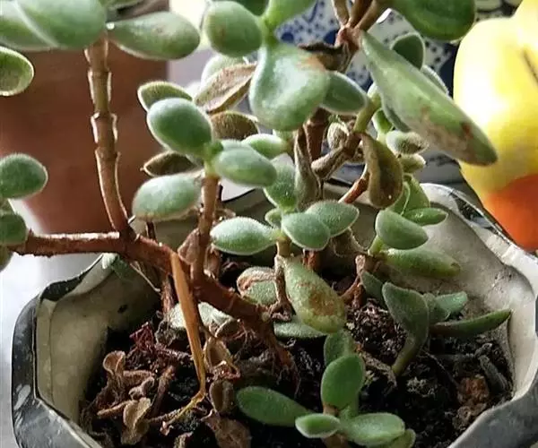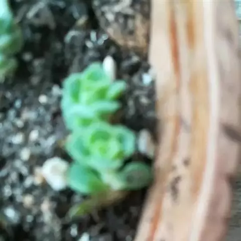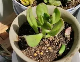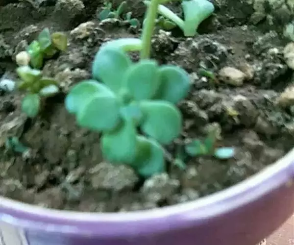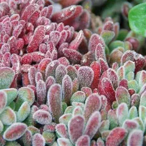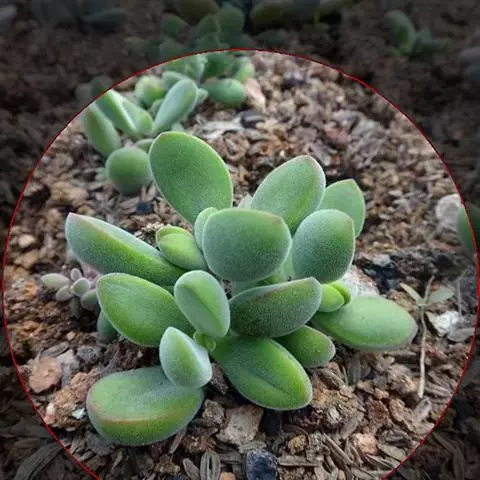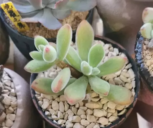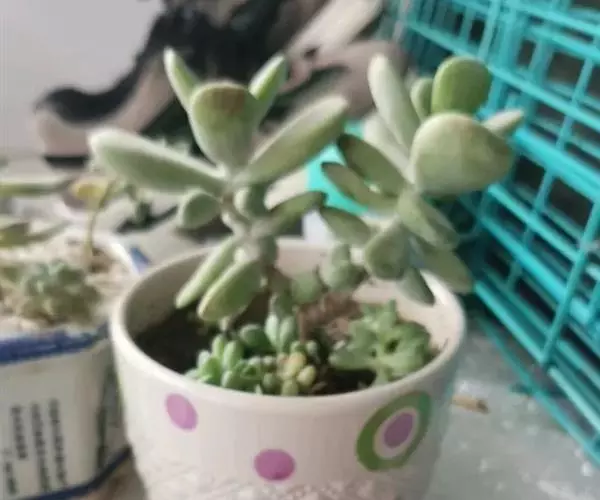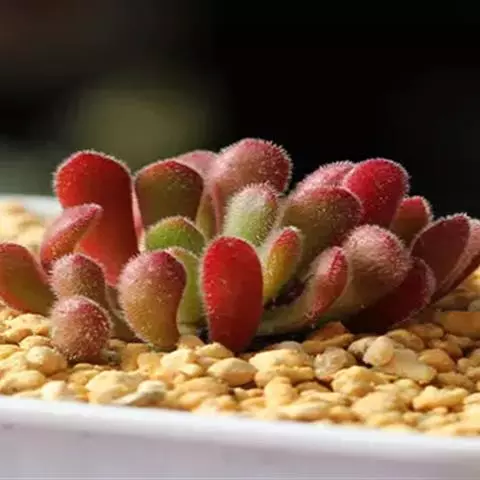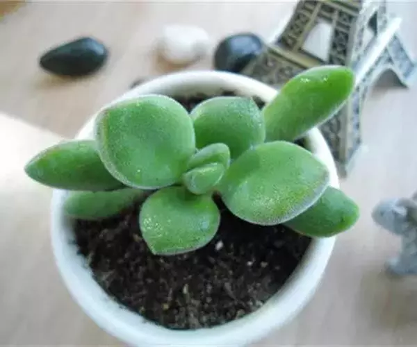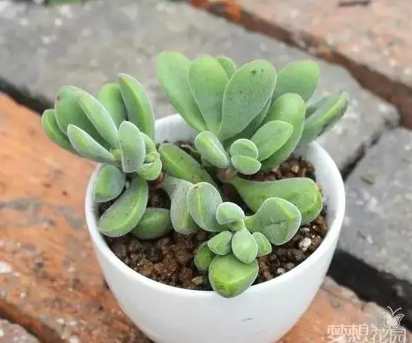易丛生,茎细柱状,淡绿色,冷凉季节在阳光下会变红。叶片对生,肉质,叶长3-3.5厘米,叶形象微型的柳琴或调羹,叶缘微黄或微红,在充足的阳光下,叶子会变得肥厚饱满,全叶覆盖细细的绒毛,长得胖嘟嘟、毛茸茸,十分可爱,新叶片出来错位排列。秋季开花,花色淡绿色。