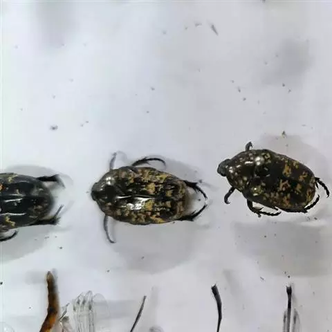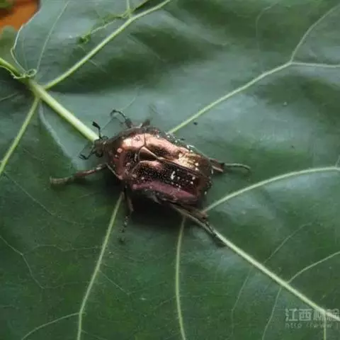 化学防治:化学防治法主要包括利用药剂处理粪肥杀死幼虫以及直接药剂喷雾杀灭成虫 。化学方法具有见效快、防治效果好、简便等优点,但由于白星花金龟成虫甲壳硬、飞翔能力强,因此一般化学喷雾防治效果并不理想。现多采用糖醋液诱杀成虫、诱集植物捕杀等措施防治该虫。