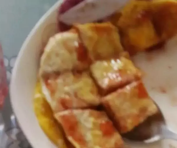 做 法: 1. 将臭豆腐洗净切成4块。2. 毛豆仁洗净,红辣椒切片。3. 广达香肉酱与调味料加上毛豆仁与红辣椒搅拌均匀。4. 臭豆腐排盘后,将作法3淋在上面,用猛火蒸约15分钟即可。