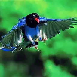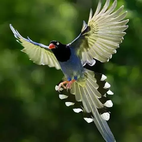 蓝绿鹊:中型鸟类,共有5个亚种。体长36-38厘米。尾长,嘴、脚红色。通体羽色主要为草绿色,…