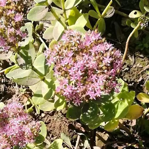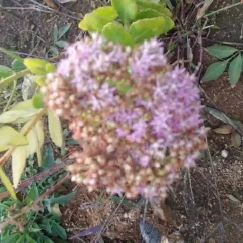 花序大形,伞房状,顶生,直径7-11厘米;花密生,直径约1厘米,萼片5,线状披针形至宽披针形,长1毫米,渐尖;花瓣5,淡紫红色至紫红色,披针形至宽披针形,长4-5毫米,雄蕊10,长6-8毫米,花药紫色;鳞片5,长方形,长1-1.2毫米,先端有微缺;心皮5,狭椭圆形,长4.2毫米,花柱长1.2毫米在内。