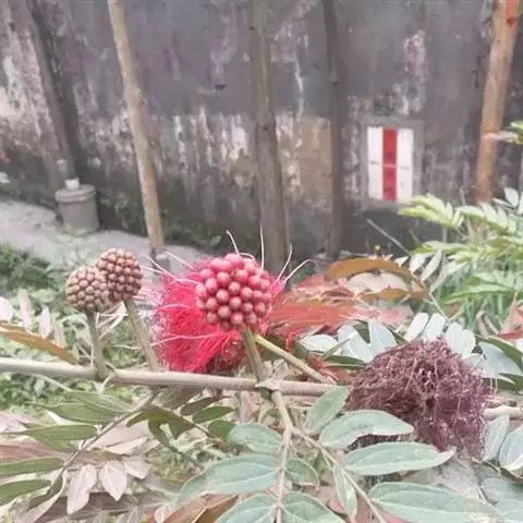 朱缨花,豆科朱缨花属的多年生木本植物,枝条扩展,小枝褐色;叶片呈卵状披针形;头状花序腋生,…