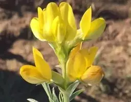 总状花序腋生,小花多枚,小花柄极短;小苞2枚,披针状线形,具毛;花萼短钟状,萼齿5;花冠蝶形,黄色,旗瓣肾形,顶面中央微凹,基部心形,翼瓣斜卵形,基部具渐狭的爪,龙骨瓣狭长,有角状突起;雄蕊10,两体,花药小;子房上位,密被短硬毛,花柱线形。