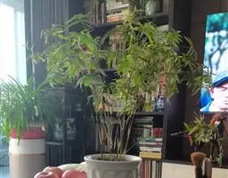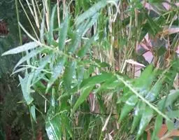 凤尾竹 Raeusch. ex Schult. ’Fernleaf’ R. A. Young)是禾本科,簕竹属孝顺竹的变种。植株较高大,杆高可达6米,竿中空,小枝稍下弯,下部挺直,绿色;竿壁稍薄;节处稍隆起,无毛;叶鞘无毛,纵肋稍隆起,背部具脊;叶耳肾形,边缘具波曲状细长繸毛;叶舌圆拱形,叶片线形,上表面无毛,下表面粉绿而密被短柔毛,小穗含小花,中间小花为两性;外稃两侧稍不对称,长圆状披针形,先端急尖;内稃线形,脊上被短纤毛,花药紫色,子房卵球形,羽毛状。成熟颖果未见。原产中国,华东、华南、西南以至台湾、香港均有栽培。凤尾竹喜温暖、湿润和阳光充足的环境,耐寒。宜土层深厚、肥沃、疏松的微酸性壤土。该种观赏价值较高,宜作庭院丛栽,也可作盆景植物。全草或根入药,味淡、微苦,性寒,有清热利湿、凉血止血、消肿解毒功效,可治痢疾、泄泻等多种病症。凤尾