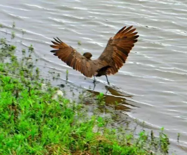 外形:锤头鹳体型较小,全长仅50厘米,体形咋一看像中型的鹭,但头、颈较短,前三趾间有微蹼。身体羽毛颜色也不漂亮,全体为褐色。雌雄同色,幼鸟也似成鸟。雏鸟多为污白色。锤头鹳奇异的外型特征是头部向后的长冠羽与嘴呈一直线使头部呈锤型,因而得名。嘴和脚黑色,虹彩褐色。