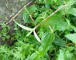 叶对生,茎端的2-3对间距极短,呈轮生状,近等大或较下部茎叶大1-2倍,叶片披针形至卵状披针形,稀卵状椭圆形,长1-4.5厘米,宽5-16毫米,先端锐尖或稍钝,基部楔状渐狭,稀为阔楔形,无毛或仅下面沿中肋被疏柔毛,干时坚纸质,两面密布粒状凸起的小腺点,中肋在下面隆起,侧脉不明显;叶柄长4-10毫米。