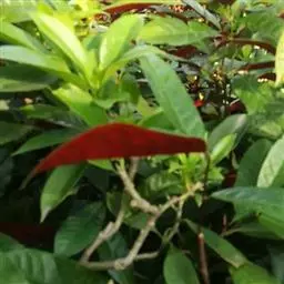 叶对生,稀兼有互生或近3片轮生,纸质,叶片狭椭圆形或长圆形,长6-14cm,宽1.2-4cm,顶端长渐尖,基部渐狭,边缘有疏细齿,齿间距3-10mm,两面均无毛,腹面绿色,背面紫红或血红色;中脉于两面均凸起,侧脉8-12对,弧曲上升,离缘弯拱连接,网脉不明显;叶柄长3-10mm,无腺体;托叶卵形,顶端尖,长约1mm。