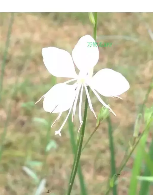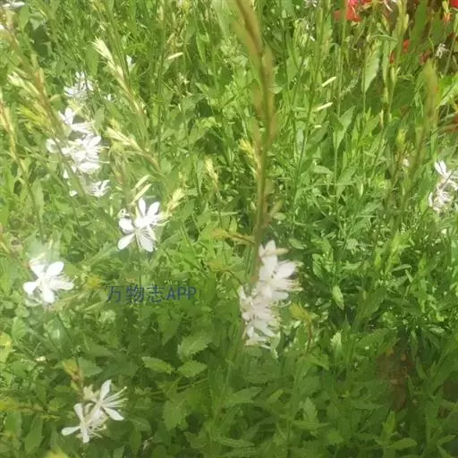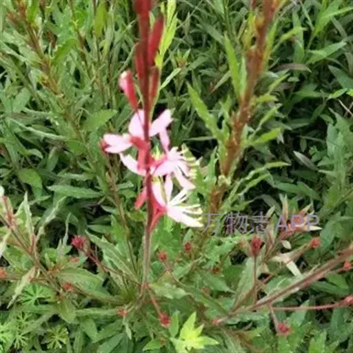 小花山桃草 一年生草本,主根径达2厘米,全株尤茎上部、花序、叶、苞片、萼片蜜被伸展灰白色长毛与腺毛;茎直立,不分枝,或在顶部花序之下少数分枝,高50-100厘米。基生叶宽倒披针形,先端锐尖,基部渐狭下延至柄。茎生叶狭椭圆形、长圆状卵形,有时菱状卵形,先端渐尖或锐尖,基部楔形下延至柄。花序穗状,有时有少数分枝,生茎枝顶端,常下垂;苞片线形。花傍晚开放;花管带红色;萼片绿色,线状披针形,花期反折;花瓣白色,以后变红色,倒卵形,先端钝,基部具爪;花丝基部具鳞片状附属物,花药黄色,长圆形,花粉在开花时或开花前直接授粉在柱头上(自花受精);花柱部分伸出花管;柱头围以花药,具深4裂。蒴果坚果状,纺锤形,具不明显4棱。种子4枚,或3枚(其中1室的胚珠不发育),卵状,红棕色。花期7-8月,果期8-9月。