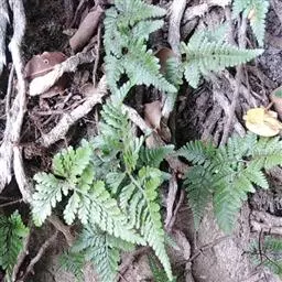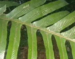 叶远生;柄长10-15厘米,粗约1毫米,浅棕色,上面有浅纵沟,光滑;叶片三角状卵形,长16-25厘米,宽14-18厘米,先端渐尖,基部为四回羽裂,中部为三回羽裂,向顶部为二回羽裂;羽片10-15对,互生,基部一对近对生,斜向上,彼此接近,基部一对最大,长8. 5-11厘米,宽4-8厘米,长三角形,渐尖头,基部不对称,柄长3-5毫米,三回深羽裂;一回小羽片约10对,互生,上先出,有短柄(长2-3毫米),羽轴上侧的略较短,基部一片与羽轴平行或覆盖羽轴,基部下侧一片最大,长4-5. 5厘米,宽2-2. 5厘米,椭圆形或长卵形,先端短渐尖,斜展,二回羽裂;二回小羽片5-7对,互生,上先出,上侧的有时略短,下侧的长8-15毫米,宽5-6毫米,椭圆形,钝头,基部为不对称的楔形,下延,深羽裂;裂片全缘,先端尖或有小缺刻;从第二对羽片起为椭圆披针形,羽轴基部上侧一片为深羽裂,其余的下侧为全缘,上侧有2-3个裂片。叶脉不甚明显,侧脉单一或分叉,几达叶边。叶革质,干后上面浅褐色,下面棕色,无毛。孢子囊群生于裂片上侧小脉顶端,每裂片1-3枚;囊群盖宽杯形,高稍过于宽,两侧边大部着生叶面,棕色,有光泽。