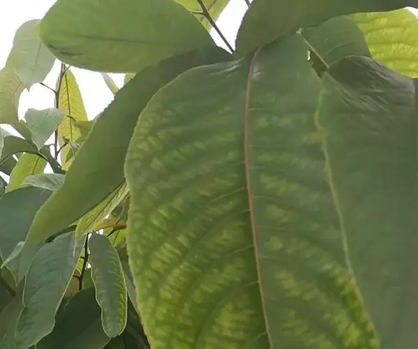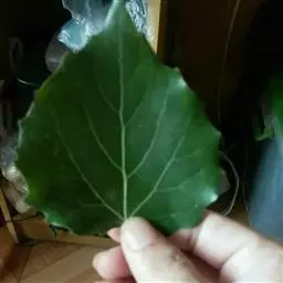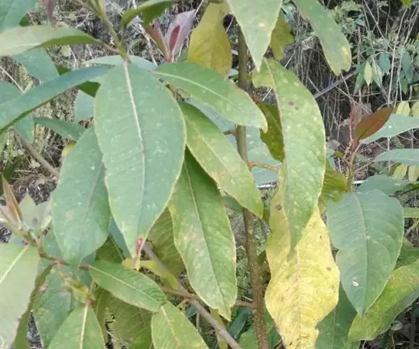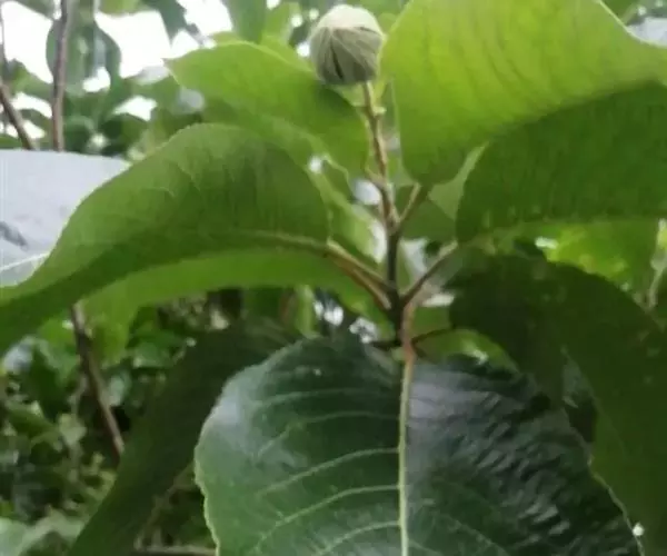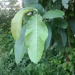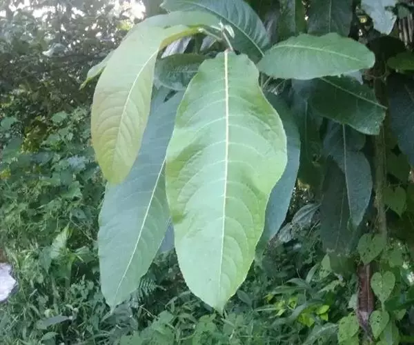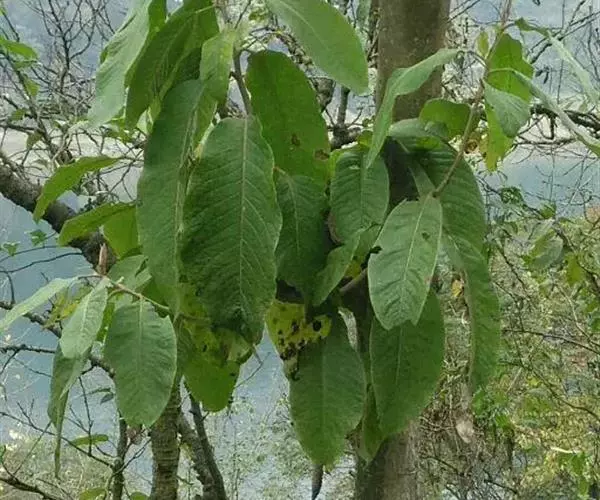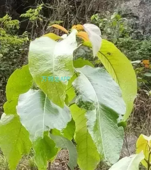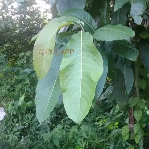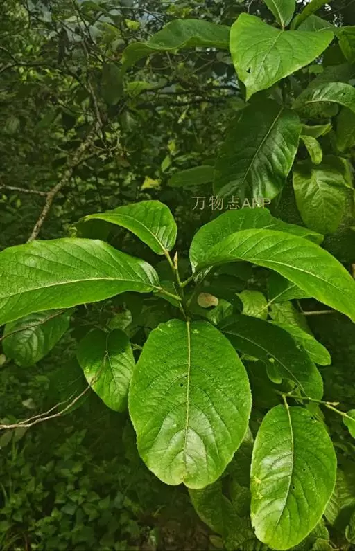 叶大型,薄革质,椭圆形或卵状长圆形或长圆状倒卵形,长13-40厘米,宽6-14厘米,先端锐尖或渐尖,基部钝或近圆形,边缘有钝齿,上面深绿色,脉上有疏毛,下面淡绿色,密生短柔毛,中脉在上面稍凹,在下面突起,羽脉 10-26对;叶柄长3-6厘米,上面扁平,下面圆形,有柔毛。