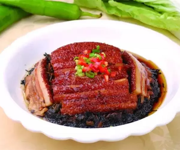 梅干菜扣肉是浙江江西地区的传统特色菜肴。用连皮五花肉烧好后,再在碗里放上腌制的梅干菜,这样梅干菜扣肉就好了。