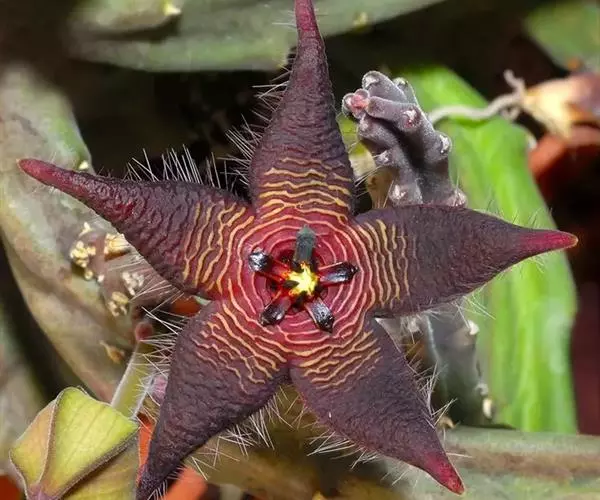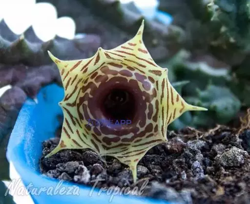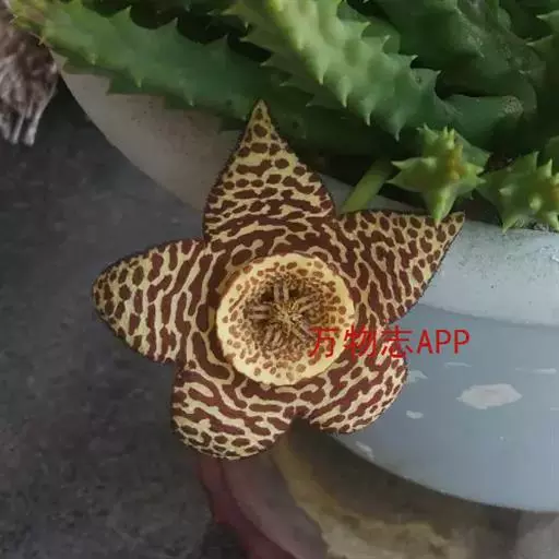 豹皮花又叫犀角,是一种多年生肉质草本植物,是较为理想的室内观赏花卉,豹皮花花期夏秋但不定时,花基生,单生或3朵至4朵并生,花径6厘米至7厘米。花瓣呈五角星状,黄色花瓣,花瓣上有棕色横纹,顶部有一个微型五角星。整个花朵光彩夺目,别具一格,是一种观赏价值很高的花卉。