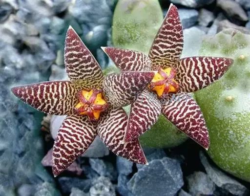豹皮花像仙人掌,是一种肉质植物,茎呈亮绿色,花单生或数朵簇生;花梗长3-4厘米;花冠五角星状,直径4-6厘米,外面绿色,光滑,内面黄绿色,具暗紫色横条纹及斑点,裂片5,三角状卵形,顶端短尖,边有睫毛。