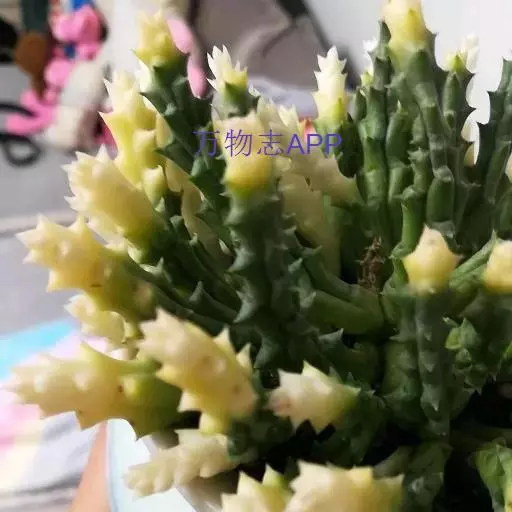 肉质植物,茎亮绿色,几株簇生在一起,高约10厘米,状似仙人掌,四棱,棱稍钝,棱具粗厚软刺,光滑,绿色。无叶。花单生或几个簇生;花梗长2-3厘米;花直径3-5厘米。蓇葖平滑:种子顶端具白色绢质种毛。