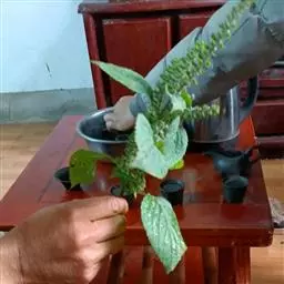 上盆不宜过满,一般离盆沿2-3厘米,并刮平压实,然后用竹签打孔,顺势将插穗插入土壤中。打插深度,以稳定插穗为准,第一次只能浇好皮面水。栽好后置于荫蔽通风的地方,每天向叶片进行3-4次雾状喷水,减少叶片水分蒸发。7-10天后,可浇一次半透水,保持土表层湿润。半个月后把水浇透,因为这时的插穗,基部已出现根原体,可以吸收一些水分。浇透水以后,可把花盆移至向阳的地方,进行阳光照射。同时,莳养者一定根据盆土墒情,保持土壤疏松、透气、湿润。注意:土壤仍然不能过湿,大约20天以后,植株根系就能吸收,并且开始生长。一个月以后,可用0.2%的磷酸二氢钾水溶液,喷酒一次,促使新根生长。40-50天后,植株开始萌发新芽,并已旺盛生长。