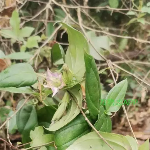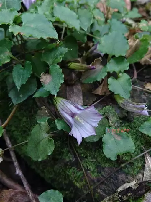 多年生缠绕草本。具短根茎,根黄褐色或深褐色,细圆柱形。茎绿色或紫红色,近圆形具细条棱,上部螺旋扭转,节间长7-17厘米。基生叶通常2对,着生于茎基部,紧贴地面,密集呈双蝴蝶状,卵形、倒卵形或椭圆形,长3-12厘米,宽(1)2-6厘米,先端急尖或呈圆形,基部圆形,近无柄或具极短的叶柄,全缘,上面绿色,有白色或黄绿色斑纹或否,下面淡绿色或紫红色;茎生叶通常卵状披针形,少为卵形,向上部变小呈披针形,长5-12厘米,宽2-5厘米,先端渐尖或呈尾状,基部心形或近圆形,叶脉3条,全缘,叶柄扁平,长4-10毫米。具多花,2-4朵呈聚伞花序,少单花、腋生;花梗短,通常不超过1厘米,具1-3对小苞片或否;花萼钟形,萼筒长9-13毫米,具狭翅或无翅,裂片线状披针形,长6-9毫米,通常短于萼筒或等长,弯缺截形;花冠蓝紫色或淡紫色,褶色较淡或呈乳白色,钟形,长3.5-4.5厘米,裂片卵状三角形,长5-7毫米,宽4-5毫米,褶半圆形,长1-2毫米,比裂片短约5毫米,宽约3毫米,先端浅波状;雄蕊着生于冠筒下部,不整齐,花丝线形,长1.3-1.9厘米,花药卵形,长约1.5毫米;子房长椭圆形,两端渐狭,长1.3-1.7厘米,柄长8-12毫米,柄基部具长约1.5毫米的环状花盘,花柱线形,长8-11毫米,柱头线形,2裂,反卷。蒴果内藏或先端外露,淡褐色,椭圆形,扁平,长2-2.5厘米,宽0.7-0.8厘米,柄长1-1.5厘米,花柱宿存;种子淡褐色,近圆形,长宽约相等,直径约2毫米,具盘状双翅。花果期10-12月。