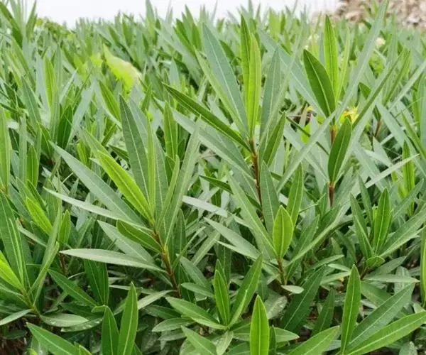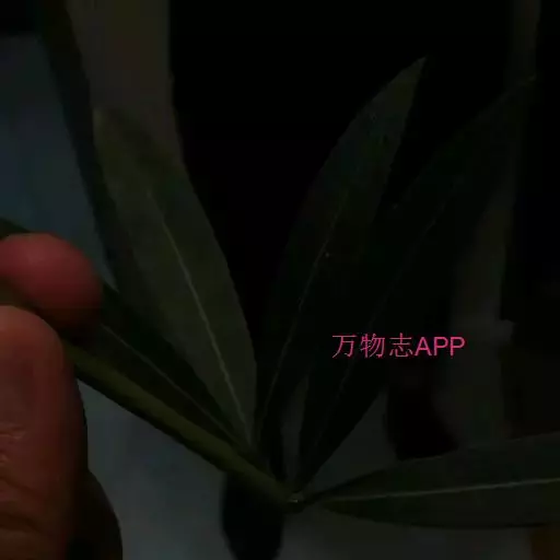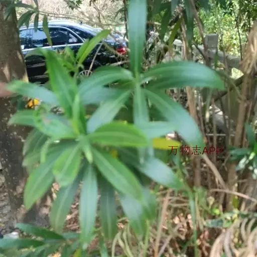 常绿直立大灌木,高达5米,枝条灰绿色,含水液;嫩枝条具棱,被微毛,老时毛脱落。叶3-4枚轮生,下枝为对生,窄披针形,顶端急尖,基部楔形,叶缘反卷,长11-15厘米,宽2-2.5厘米,叶面深绿,无毛,叶背浅绿色,有多数洼点,幼时被疏微毛,老时毛渐脱落;中脉在叶面陷入,在叶背凸起,侧脉两面扁平,纤细,密生而平行,每边达120条,直达叶缘;叶柄扁平,基部稍宽,长5-8毫米,幼时被微毛,老时毛脱落;叶柄内具腺体。