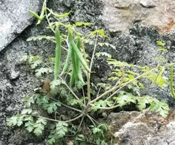 花序较长,可达25厘米,花较大,上面花瓣长15-18毫米,囊距长6-8毫米;蒴果串珠状;种子密生圆锥状小凸起,可以区别。成分含阿片碱等多种生物碱茎具棱,分枝,具叶,枝条花葶状,对叶生。基生叶具长柄,常早枯萎。茎生叶具短柄,叶片三角形,上面绿色,下面灰白色,二回羽状全裂,一回羽片约3-4对,具短柄,二回羽片1-2对,卵圆形至宽卵圆形,约长2厘米,宽1.5厘米,通常二回三深裂,末回裂片圆钝,近具短尖。总状花序长3-10厘米,密具多花,后渐疏离。苞片披针形至钻形,渐尖至具短尖,约与花梗等长。花梗长3-5毫米。花黄色至淡黄色。萼片小,卵圆形,早落。外花瓣不宽展,无鸡冠状突起,顶端通常近圆,具宽短尖,有时近下凹,有时具较长的短尖。上花瓣长约6-7毫米;距短囊状,约占花瓣全长的1/5-1/6;蜜腺体约占距长的1/2。子房线形,近扭曲,约与花柱等长;柱头宽浅,具4乳突,顶生2枚呈广角状叉分,侧生的先下弯再弧形上升。蒴果线形,具1列种子。种子黑亮,近肾形,具短刺状突起,种阜三角形。