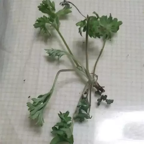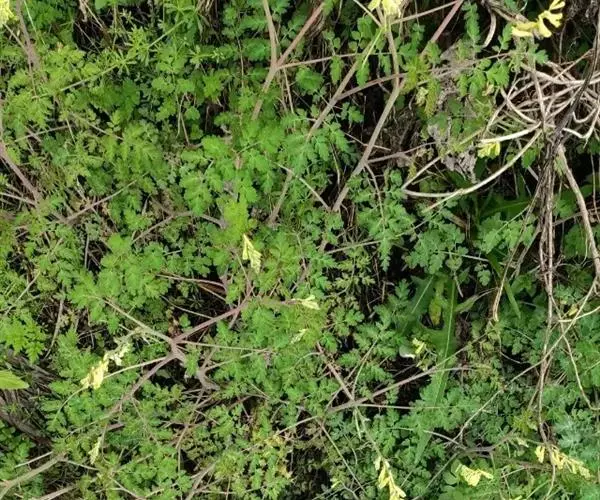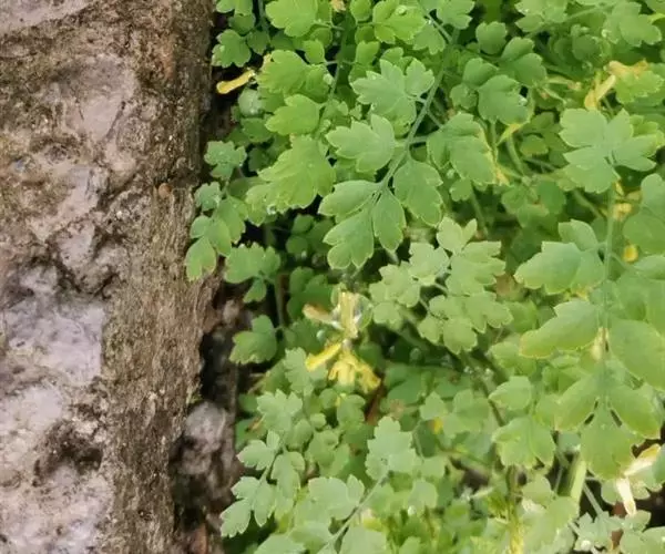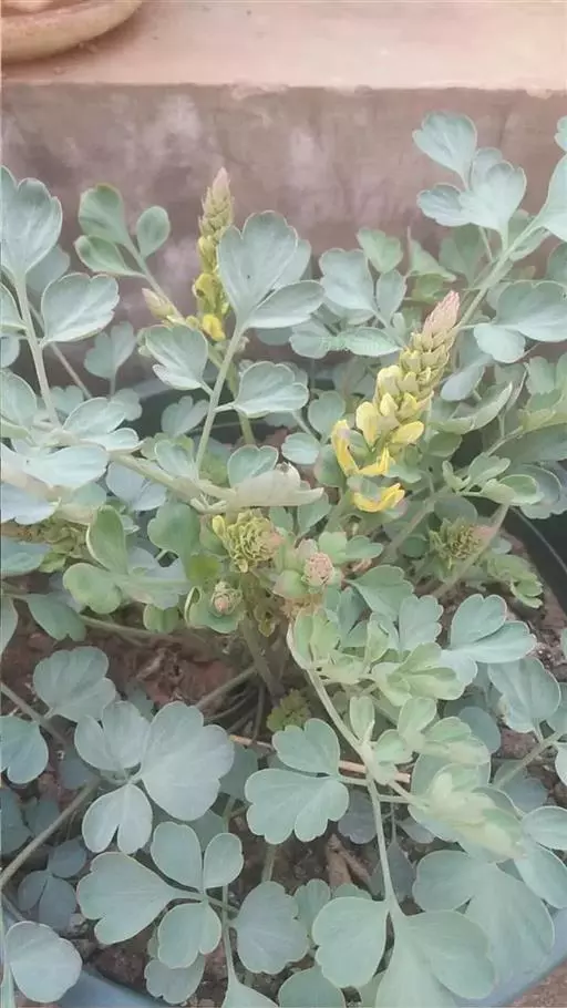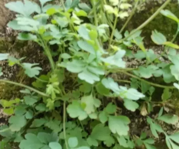 黄堇 灰绿色丛生草本,高20-60厘米,具主根,少数侧根发达,呈须根状。茎1至多条,发自基生叶腋,具棱,常上部分枝。基生叶多数,莲座状,花期枯萎。茎生叶稍密集,下部的具柄,上部的近无柄,上面绿色,下面苍白色,二回羽状全裂,一回羽片约4-6对,具短柄至无柄,二回羽片无柄,卵圆形至长圆形,顶生的较大,约长1.5-2厘米,宽1.2-1.5厘米,三深裂,裂片边缘具圆齿状裂片,裂片顶端圆钝,近具短尖,侧生的较小,常具4-5圆齿。