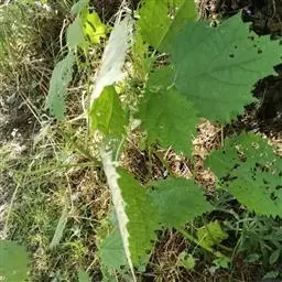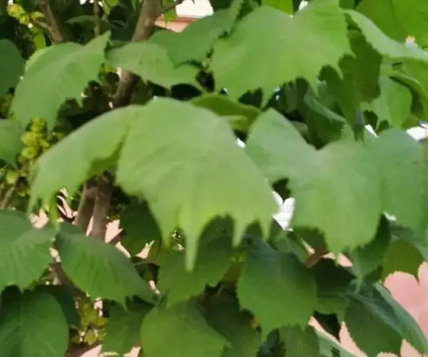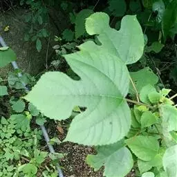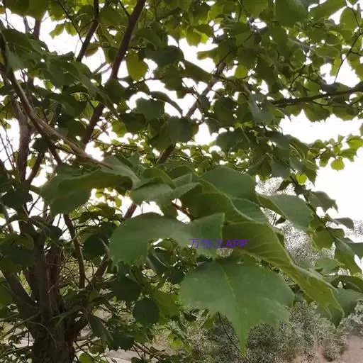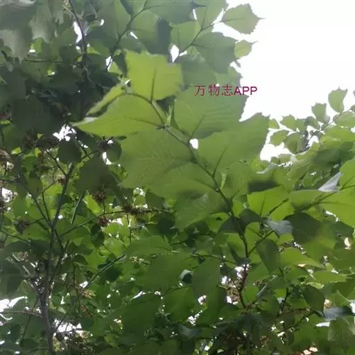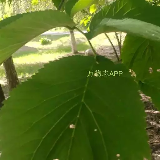 叶倒卵形、倒三角状、倒三角状椭圆形或倒卵状长圆形,长7-18厘米,宽4-14厘米,先端通常3-7裂,裂片三角形,渐尖或尾状,不裂之叶先端具或长或短的尾状尖头,基部明显地偏斜,楔形、微圆、半心脏形或耳状,较长的一边常覆盖叶柄,与柄近等长,其下端常接触枝条,边缘具较深的重锯齿,叶面密生硬毛,粗糙,叶背被柔毛,沿叶脉较密,脉腋常有簇生毛,侧脉每边10-17条,叶柄极短,长2-5毫米,密被短毛或下面的毛较少。