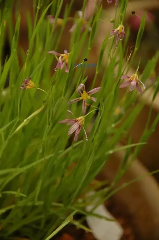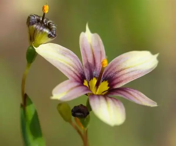 叶基生或互生,狭条形,长6-9厘米,宽2-3毫米,基部鞘状抱茎,顶端渐尖,无明显的中脉。花序顶生;苞片5-7枚,外侧2枚狭披针形,边缘膜质,绿色,长2-2.5厘米,内侧3-5枚膜质,无色透明,内包含有4-6朵花;花淡紫色,喉部黄色,直径0.8-1厘米;花梗丝状,长约2.5厘米;花被管甚短,有纤毛,内、外花被裂片同形,等大,2轮排列,倒卵形至倒披针形,长约1.2厘米,宽约4毫米,顶端突尖,白色,有浅紫色的条纹,外展,爪部楔形,鲜黄色,并有浓紫色的斑纹;雄蕊3,花丝上部分离,下部合成管状,包住花柱,外围有大量的腺毛,花药鲜黄色;花柱丝状,上部3裂,子房圆球形,绿色,生有纤毛。蒴果球形,直径2.5-4毫米,黄褐色或棕褐色,成熟时室背开裂;种子多数,黑褐色。花期5月,果期6-8月。