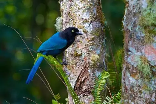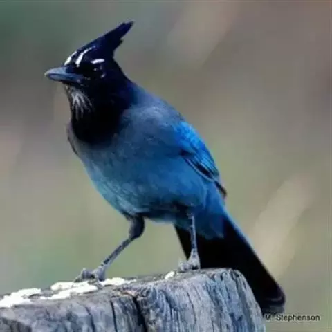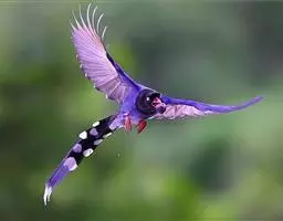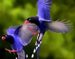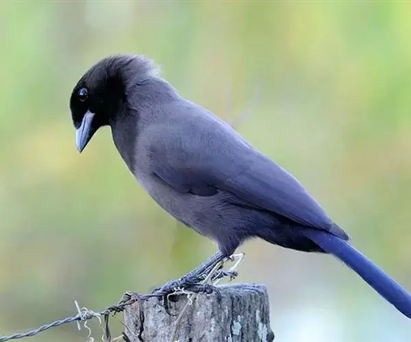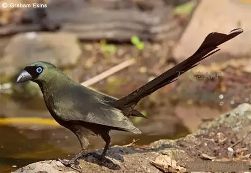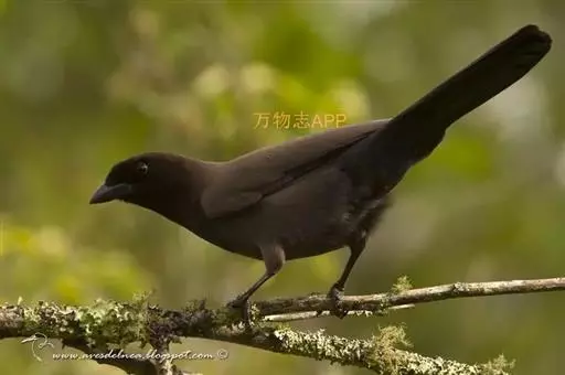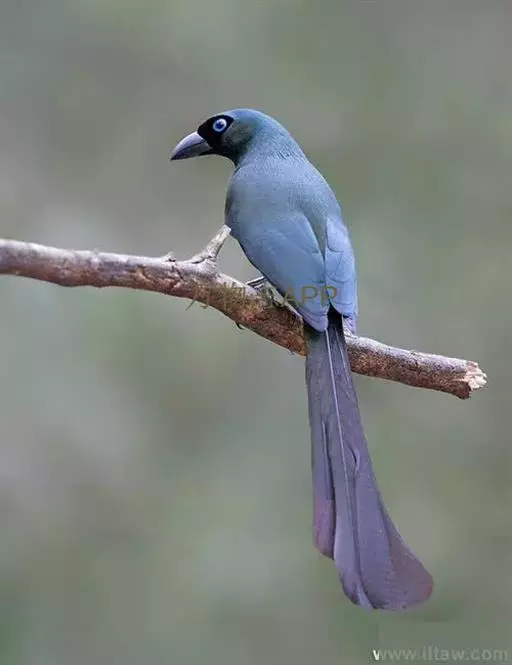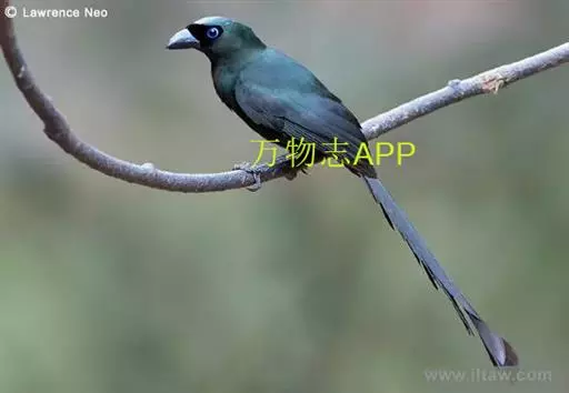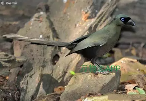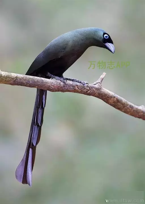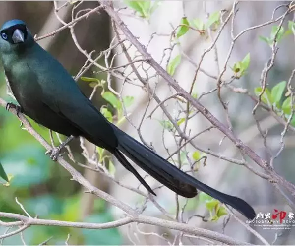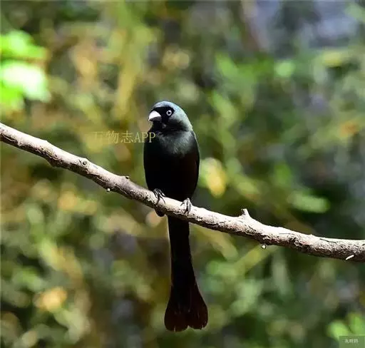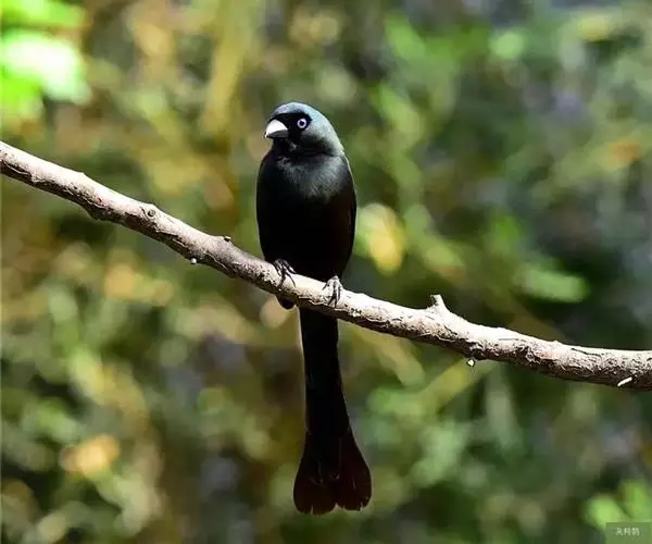 盘尾树鹊(图2) 盘尾树鹊体形中等,身长约35厘米,包括尾长18厘米。是近黑色树鹊。尾甚长而端部展开,通体体羽有金属光泽,具闪亮深灰色,并具铜绿色光泽,嘴粗厚而呈钩状,眼显著蓝色。虹膜-蓝色,嘴-黑色,脚-黑色。 两性相同。第一次换毛的幼鸟羽色更沉闷,偏暗灰,尾巴细长而窄,没有抹刀形式的盘尾。该喙是黑色,嘴尖橙色,眼环橙色,边界淡蓝色。第一年的亚成鸟也有别于成鸟而更加暗灰,尾部保留原来的形状,嘴黄色而不是橙色。在第二次换羽后,会获得成鸟的羽毛,直到2岁才完全与父母相同。