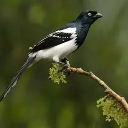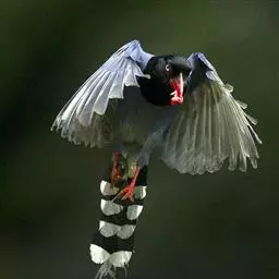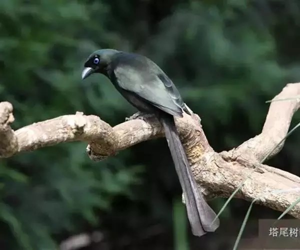 盘尾树鹊,是雀形目鸦科的珍稀鸟类,是一种中等体型的近黑色树鹊。尾甚长而端部展开;通体体羽闪亮深灰色,并具铜绿色光泽;嘴粗厚而呈钩状;眼先蓝色。虹膜蓝色;嘴黑色;脚黑色。单独或成对活动,栖于次生林、竹林、灌丛以至庭院。中国西南部、东南亚至爪哇。于中国罕见。仅在云南南部低地,尤其在红河流域有记录。