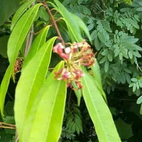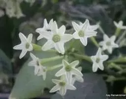 攀援灌木,除幼花被短柔毛外其余无毛。叶长圆形,长5.5-6厘米,宽1.7-2厘米,顶部渐尖,基部急尖;中脉两面凸起,侧脉两面扁平,纤细;叶腋内外具腺体;叶柄长4毫米。聚伞花序圆锥状,顶生和腋生;花蕾顶部钝形;萼片渐尖;花冠白色,花冠筒长4-6毫米,近花喉部膨大,花喉顶口缢缩,被短柔毛,花冠裂片长6-10毫米,宽1-1.5毫米;雄蕊着生于近花喉部,花药顶端不伸出花喉之外,花丝短,被短柔毛;子房由2枚离生心皮组成,每心皮胚珠多数,花柱丝状,柱头卵状;花盘环状5裂,围绕子房基部。花期5月。 [1-2]
