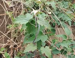 枝、叶光滑无毛。三出复叶;小叶片纸质,长椭圆状披针形或卵状披针形,长7-11厘米,宽2-5厘米,顶端渐尖,基部圆形或宽楔形,有时偏斜,上部边缘有不整齐的浅锯齿,下部常全缘, 表面绿色,背面灰白色,基出主脉3条,稀5条,在表面不显,在背面隆起;小叶柄短,常扭曲,叶柄长4-7厘米。