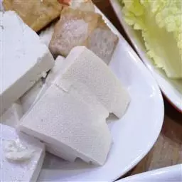 3、豆腐放入沸水中煮3分钟,捞起沥干水分,切小块。