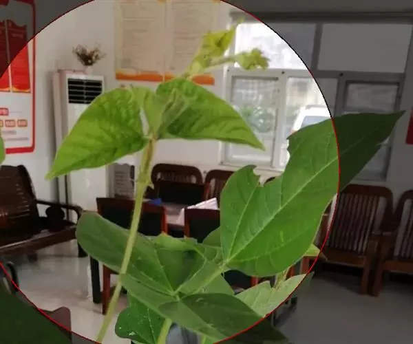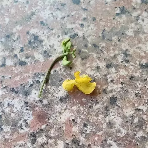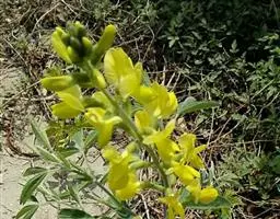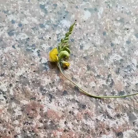 一年生直立草本,高20-60厘米。茎被褐色长硬毛。羽状复叶具3小叶;托叶盾状着生,卵形,长0.8-1.2厘米,具缘毛;小托叶显著,披针形;小叶卵形,长5-16厘米,宽3-12厘米,侧生的多少偏斜,全缘,先端渐尖,基部阔楔形或浑圆,两面多少被疏长毛,基部三脉明显;叶柄长5-21厘米;叶轴长1.5-4厘米;小叶柄长3-6毫米。总状花序腋生,有花4至数朵,最多可达25朵;总花梗长2.5-9.5厘米;花梗长2-3毫米;小苞片线状披针形或长圆形,长4-7毫米,有线条,近宿存;萼管无毛,长3-4毫米,裂片狭三角形,长1.5-4毫米,具缘毛,上方的一对合生成一先端2裂的裂片;旗瓣近方形,长1.2厘米,宽1.6厘米,外面黄绿色,里面有时粉红,顶端微凹,内弯,无毛;翼瓣卵形,黄色;龙骨瓣镰刀状,绿色而染粉红,右侧有显著的囊。荚果线状圆柱形,平展,长4-9厘米,宽5-6毫米,被淡褐色、散生的长硬毛,种子间多少收缩;种子8-14颗,淡绿色或黄褐色,短圆柱形,长2.5-4毫米,宽2.5-3毫米,种脐白色而不凹陷。花期初夏,果期6-8月。