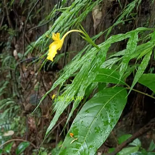 细弱、丛生草本,茎高15-30厘米,径约3毫米。叶5-9片,叶片披针形,长5-14厘米,宽1-2厘米,顶端长尾状渐尖,基部急尖,质薄,无毛,最下部的一片叶较上部的显著地小,无柄或具极短的柄;叶舌圆形,膜质,长不及2毫米。花序顶生,苞片2-3枚,披针形,长3-5厘米,顶端尾状渐尖,内有花1-2朵;花萼管状,长1-1.5厘米;花冠黄色,管长约3厘米,花冠裂片披针形,长约1厘米;侧生退化雄蕊椭圆形,长约1.2厘米;唇瓣黄色,宽卵形,长约1.5-2厘米;花丝短,花药长3毫米;药隔附属体长圆形,长约4毫米。果卵状长圆形,长约1厘米,顶端有宿萼。花期