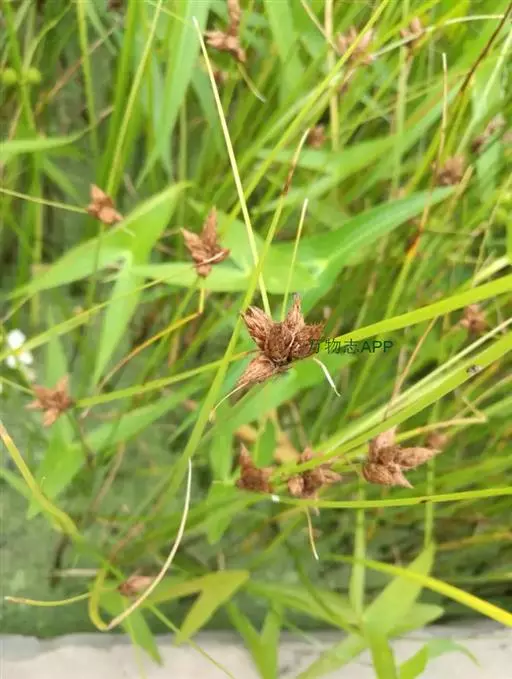 具匍匐根状茎和块茎。秆高60—100厘米,一般较细,三棱形,平滑,靠近花序部分粗糙,基部膨大,具秆生叶。叶平张,宽2—5毫米,向先端渐狭,具长鞘。苞片1—3枚,叶状,通常长于花序,边缘粗糙;长侧枝聚伞花序短缩成头状,或有时具少数辐射枝,通常具1—6个小穗;小穗卵形或长圆状卵形,锈褐色,外面被稀少的柔毛,背面具1条稍宽的中肋,先端或多或少缺刻状撕裂,具芒;下位刚毛4—6条,上生小刺,长为小坚果的1/2—2/3;雄蕊3,花药线形,长约3毫米,药隔稍突出;花柱长,柱头2。小坚果倒卵形,扁,两面稍凹或稍凸,长3—3.5毫米。花果期5—9月。