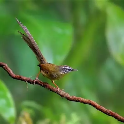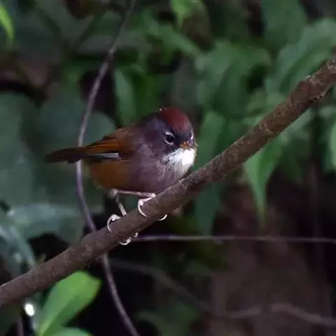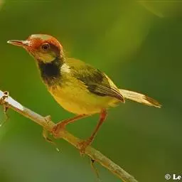 黑喉缝叶莺:体长11.5厘米,是一种小型的顶冠棕色、腹部白色的莺。尾甚长而常上翘,臀黄色,…