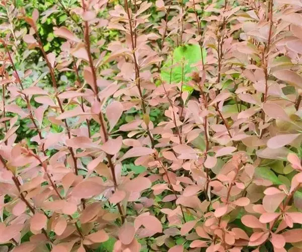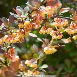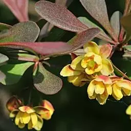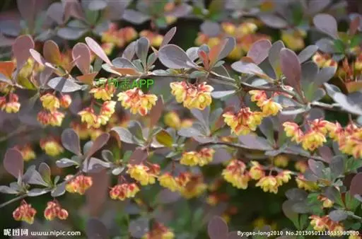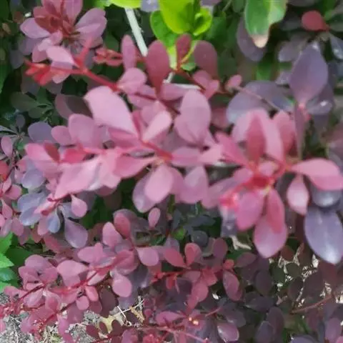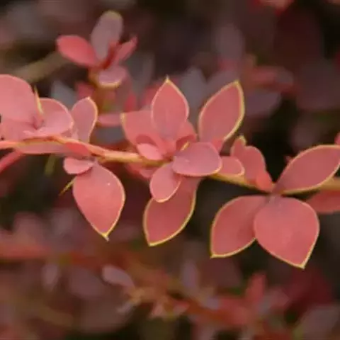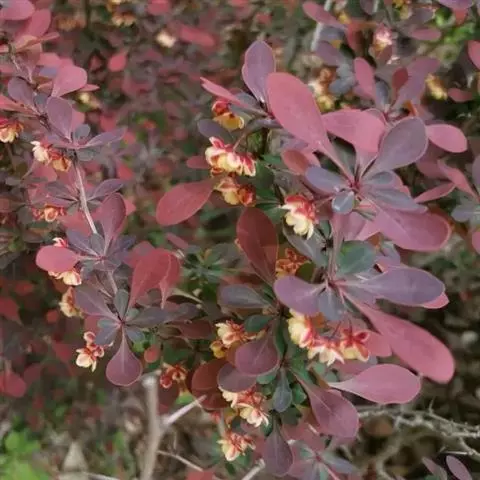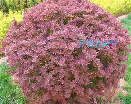 紫叶小檗是日本小檗的自然变种。落叶灌木。幼枝淡红带绿色,无毛,老枝暗红色具条棱;节间长1-1.5厘米。叶菱状卵形,长5-20(35)毫米,宽3-15毫米,先端钝,基部下延成短柄,全缘,表面黄绿色,背面带灰白色,具细乳突,两面均无毛。花2-5朵成具短总梗并近簇生的伞形花序,或无总梗而呈簇生状,花梗长5-15毫米,花被黄色;小苞片带红色,长约2毫米,急尖;外轮萼片卵形,长4-5毫米,宽约2.5毫米,先端近钝,内轮萼片稍大于外轮萼片;花瓣长圆状倒卵形,长5.5-6毫米,宽约3.5毫米,先端微缺,基部以上腺体靠近;雄蕊长3-3.5毫米,花药先端截形。浆果红色,椭圆体形,长约10毫米,稍具光泽,含种子1-2颗。