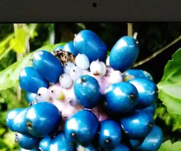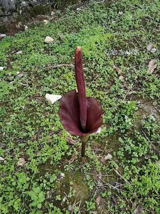 花序柄长50-70厘米,粗1.5-2厘米,色泽同叶柄。佛焰苞漏斗形,长20-30厘米,基部席卷,管部长6-8厘米,宽3-4厘米,苍绿色,杂以暗绿色斑块,边缘紫红色;檐部长15-20厘米,宽约15厘米,心状圆形,锐尖,边缘折波状,外面变绿色,内面深紫色。肉穗花序比佛焰苞长1倍,雌花序圆柱形,长约6厘米,粗3厘米,紫色;雄花序紧接(有时杂以少数两性花),长8厘米,粗2-2.3厘米;附属器伸长的圆锥形,长20-25厘米,中空,明显具小薄片或具棱状长圆形的不育花遗垫,深紫色。花丝长1毫米,宽2毫米,花药长2毫米。子房长约2毫米,苍绿色或紫红色,2室,胚珠极短,无柄,花柱与子房近等长,柱头边缘3裂。浆果球形或扁球形,成熟时黄绿色。花期4-6月,果8-9月成熟。
