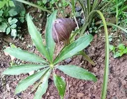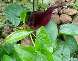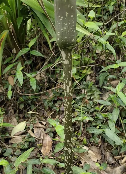 花魔芋(学名:Amorphophallus konjac K.Koch)是天南星科磨芋属中午,块茎扁球形,直径7.5-25厘米,顶部中央多少下凹,暗红褐色。叶柄长45-150厘米,基部粗3-5厘米。花序柄长50-70厘米,粗1.5-2厘米,色泽同叶柄。浆果球形或扁球形,成熟时黄绿色。花期4-6月,果8-9月成熟。