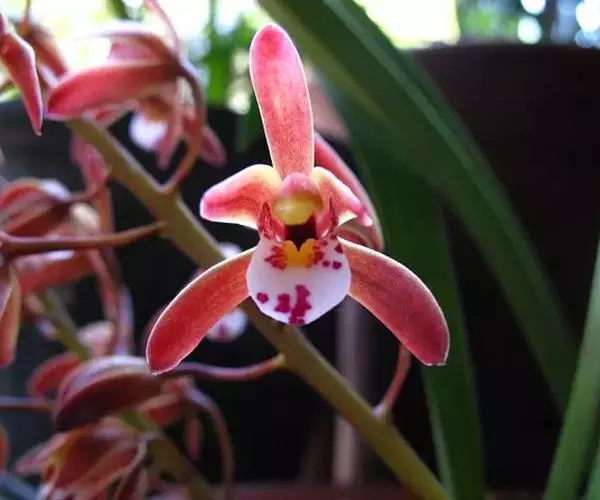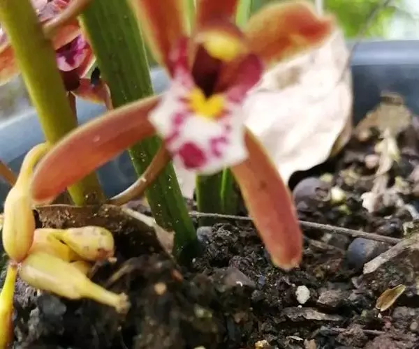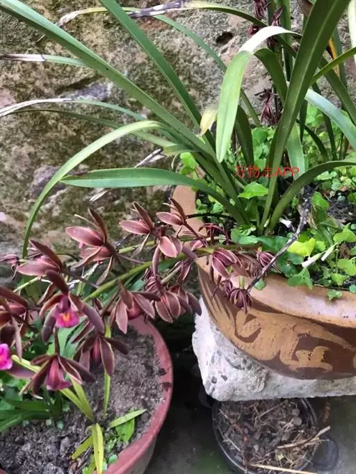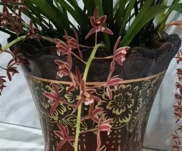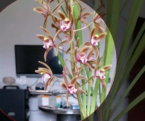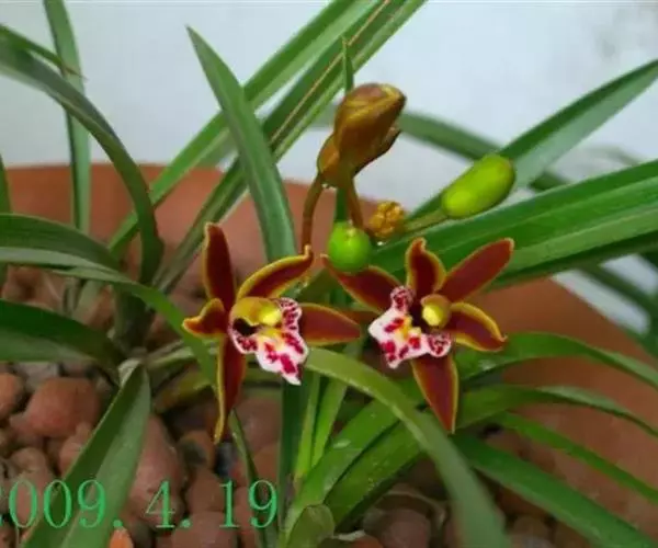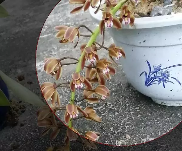 花草发自假鳞茎基部,下垂或外弯,长36~50 cm,近基部具数枚鞘;花序长20~30 cm,具20~40花;花苞片卵状披针形,长4~5 mm;花梗和子房长1.5~2 cm;花浅褐色,直径3~3.5 cm;萼片与花瓣有浅紫色脉和细斑点;唇瓣有浅紫色晕,基部有浅紫色细斑点,在中部两侧有2个深紫色斑块,唇瓣3裂,约等长于花瓣,上面具乳突,侧裂片近半圆形,直立,有紫褐色条纹,边绿紫红色,中裂片近圆形,稍反折,紫红色,中部有浅黄色晕,唇盘从基部至中部具2条平行的褶片,褶片黄色;萼片近相等,萼片狭椭圆形至卵状披针形,长20~22 mm,宽6~7 mm,先端渐尖,红褐色,中部略带黄绿色,边缘稍向后反卷。