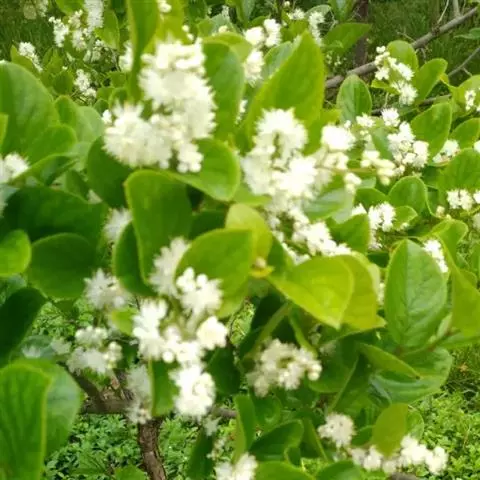 小乔木;芽、嫩枝、嫩叶背面脉上、花序均被黄褐色柔毛,小枝细长,黑褐色,无毛。叶纸质或近膜质,干后有时呈红褐色,卵形至阔披针形,长3-6(9)厘米,宽1.5-2.5(3.5) 厘米,先端尾状渐尖,基部阔楔形或稍圆,边缘具稀疏的浅钝锯齿;中脉在叶面平坦,侧脉纤细,每边6-9条;叶柄长约5毫米。穗状花序长1-4厘米;苞片椭圆状卵形,长约2毫米,小苞片三角状阔卵形,长1.5毫米,宽2毫米,背面均被短柔毛,有缘毛;花萼长1.6-2毫米,5裂,裂片卵形,顶端圆,背面被微柔毛,与萼筒等长或稍长于萼筒,萼筒无毛;花冠淡黄色,5深裂几达基部,裂片椭圆形,长2.5-4毫米;雄蕊约25枚,花丝基部稍合生;子房3室,花盘无毛。核果近球形,直径约4毫米,顶端宿萼裂片直立。花期3-11月,果期6-12月;边开花边结果。