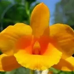 独角石斛,Dendrobium unicum,兰科石斛属植物。花瓣橙黄色,唇瓣反转似犀牛角,…