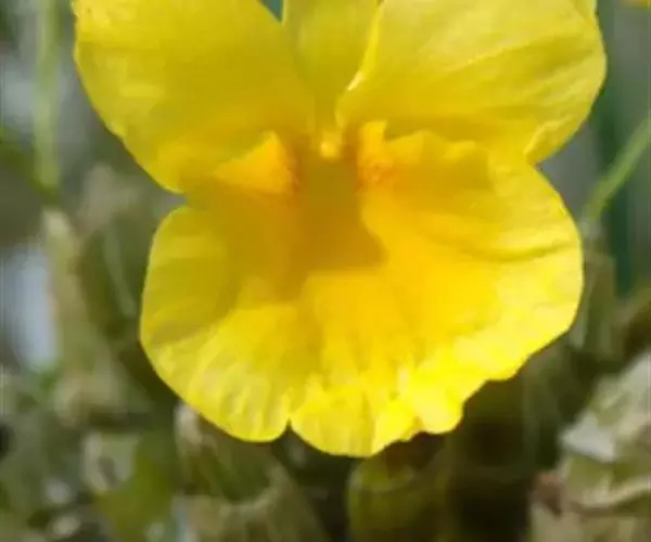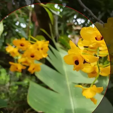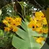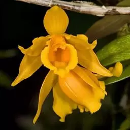 总状花序通常从落了叶的老茎中部发出,近直立,长12-15厘米,疏生2至数朵花;花序柄基部被2-3枚膜质鞘;花苞片浅白色,小,卵形,长约5毫米,宽3毫米,先端锐尖;花梗和子房淡黄绿色,长约2厘米;花金黄色,开展;中萼片卵状披针形,长1.2厘米,中部宽5毫米,先端急尖,具3条脉;侧萼片与中萼片近等大;萼囊近长圆形,长约4毫米,末端圆钝。