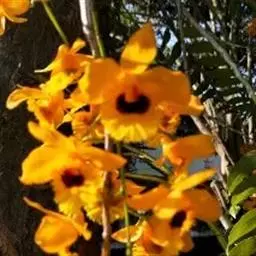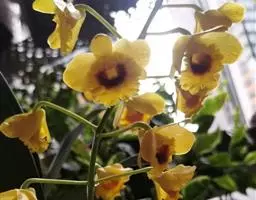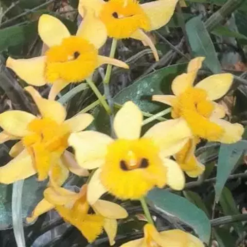 短棒石斛(学名:Dendrobium capillipes Rchb. f.):茎肉质状,近扁的纺锤形,不分枝,具多数钝的纵条棱和少数节间。叶2-4枚近茎端着生,革质,狭长圆形。总状花序通常从落了叶的老茎中部发出,近直立,长12-15厘米,疏生2至数朵花;花金黄色,开展;花瓣卵状椭圆形,长1.5厘米,宽9毫米,先端稍钝,具4条脉;唇瓣的颜色比萼片和花瓣深,近肾形。花期3-5月。