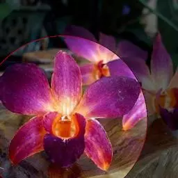 花瓣卵状椭圆形,长1.5厘米,宽9毫米,先端稍钝,具4条脉;唇瓣的颜色比萼片和花瓣深,近肾形,长2厘米,宽2.5厘米,先端微凹,基部两侧围抱蕊柱并且两侧具紫红色条纹,边缘波状,两面密被短柔毛;蕊柱金黄色,长约4毫米;药帽多少呈塔状,前端边缘近截形并且有缺刻;药床宽阔,其两侧上缘具不整齐的细缺刻。花期3-5月。