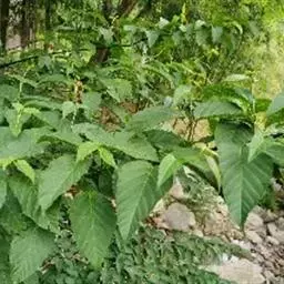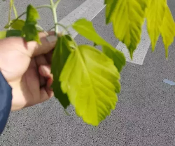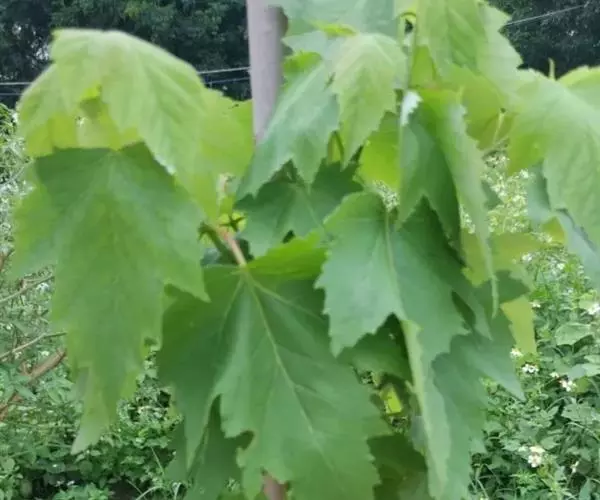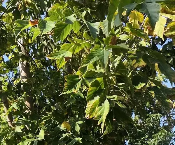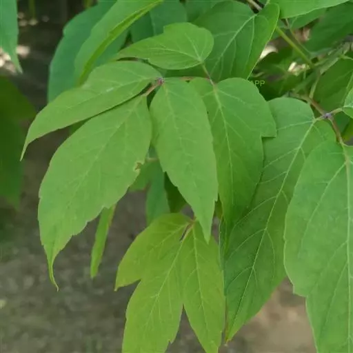 奇数羽状复叶,小叶3-7,叶柄长3-7厘米,生有短绒毛,黄绿色,顶生小叶有柄,长约1.5厘米;小叶片卵形,长5-8 厘米,宽3-4厘米,基部广楔形或钝圆形,先端锐尖,边缘有不整齐的疏锯齿;侧生小叶柄短,长3毫米;小叶片歪卵状披针形,长4-7厘米,宽2.5-3厘米,基里歪楔形或近圆形,先端锐尖,边缘具3-5个粗锯齿,表面绿色,背面黄绿色,脉及边缘生有短绒毛。